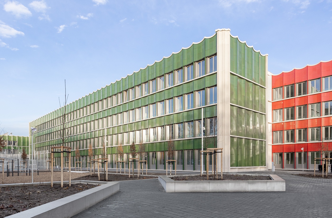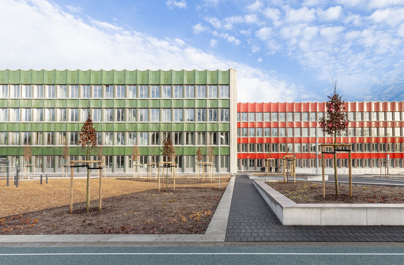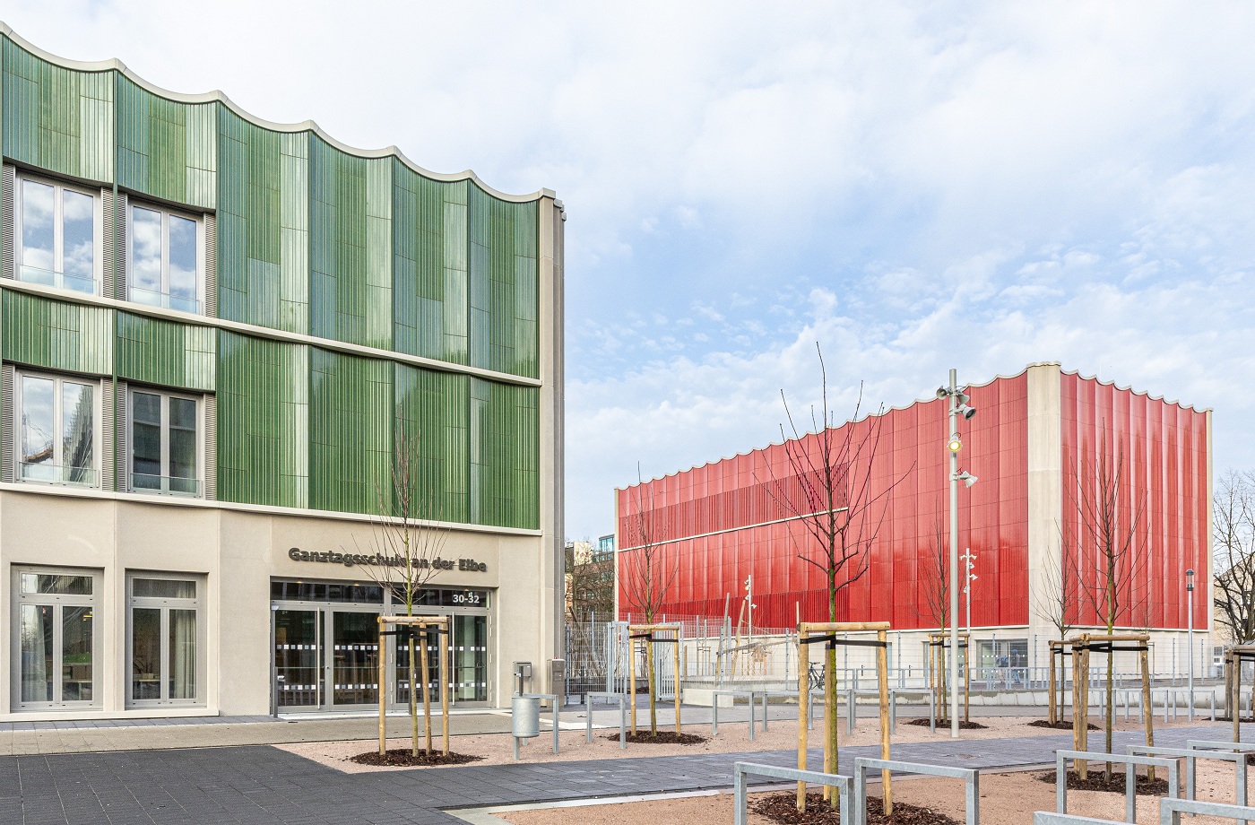 Mit dem neuen Schulcampus Struenseestraße entsteht in Hamburg-Altona ein markanter Bildungsstandort. Zwei Gymnasien, eine Grundschule, drei Sporthallen sowie großzügige Freianlagen bilden das neue Ensemble und formen entlang der Königstraße eine urbane Raumkante. Für die Fassaden entwickelte die ARGE Rohdecan QuerfeldEins Architekten gemeinsam mit MOEDING objektspezifische Keramiktafeln. Straßenseitig greifen fein gegliederte Lisenen das Motiv des roten Ziegels auf, während hofseitig grün abgestimmte Keramikflächen einen Kontrast setzen. Die individuell entworfenen Tafeln verleihen dem Ensemble eine plastisch strukturierte Gebäudehülle mit lebendigem Licht- und Schattenspiel.