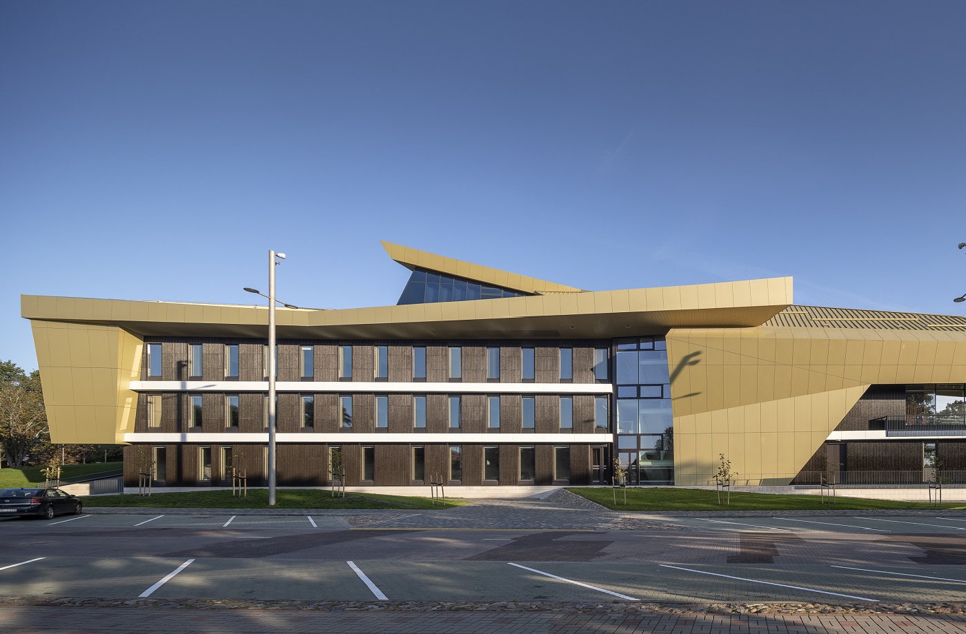 Para la nueva sala de conciertos de Ventspils, los arquitectos de haascookzemmrich STUDIO2050 diseñaron una estructura única. Además del característico techo del complejo, también el material de la fachada se planificó y produjo de manera totalmente individual según los requisitos de los arquitectos. Las placas de ladrillo esmaltadas tienen un efecto casi negro a la sombra, si bien, a la luz del sol, adoptan el brillo dorado del techo. La combinación entre el esmaltado con efectos de nuevo desarrollo y la superficie decapada recuerda al tacto y al aspecto de la madera y sirve de enlace perfecto entre los distintos elementos del edificio. De este modo, se tomó también un elemento parcial de la estructura de placas de cerámica y se integró como elemento de sombreado delante de las ventanas.